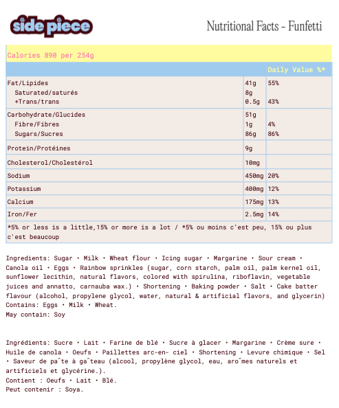 A playful and colourful moist 2-layer vanilla sponge made with a cake batter vanilla buttercream. Finished with more sprinkles! We recommend slicing into 16 portions while still slightly frozen.