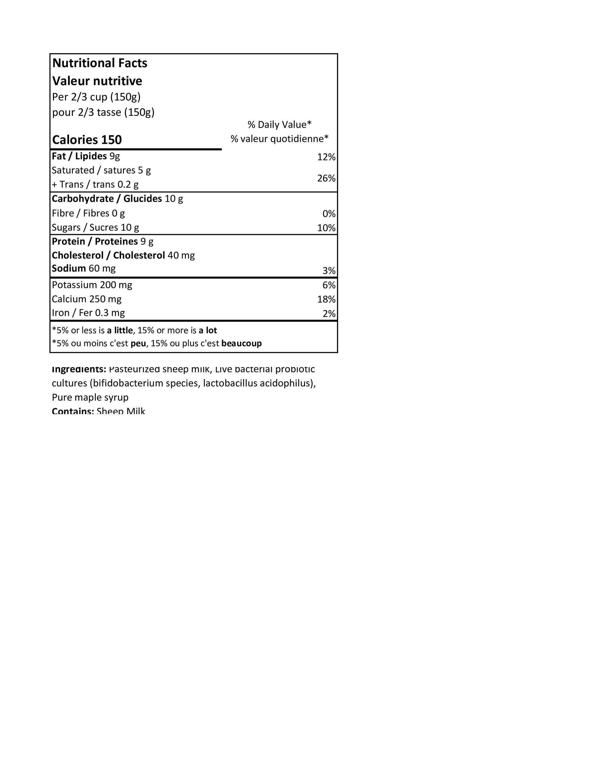 A rich creamy sheep yogurt that has a hint of maple syrup. Made with whole sheep milk and probiotic bacterial culture, our Maple Yogurt has one additional ingredient: Pure local Maple Syrup! Check out the only probiotic sheep milk on the market! This single serve container has a handy spoon in the lid.