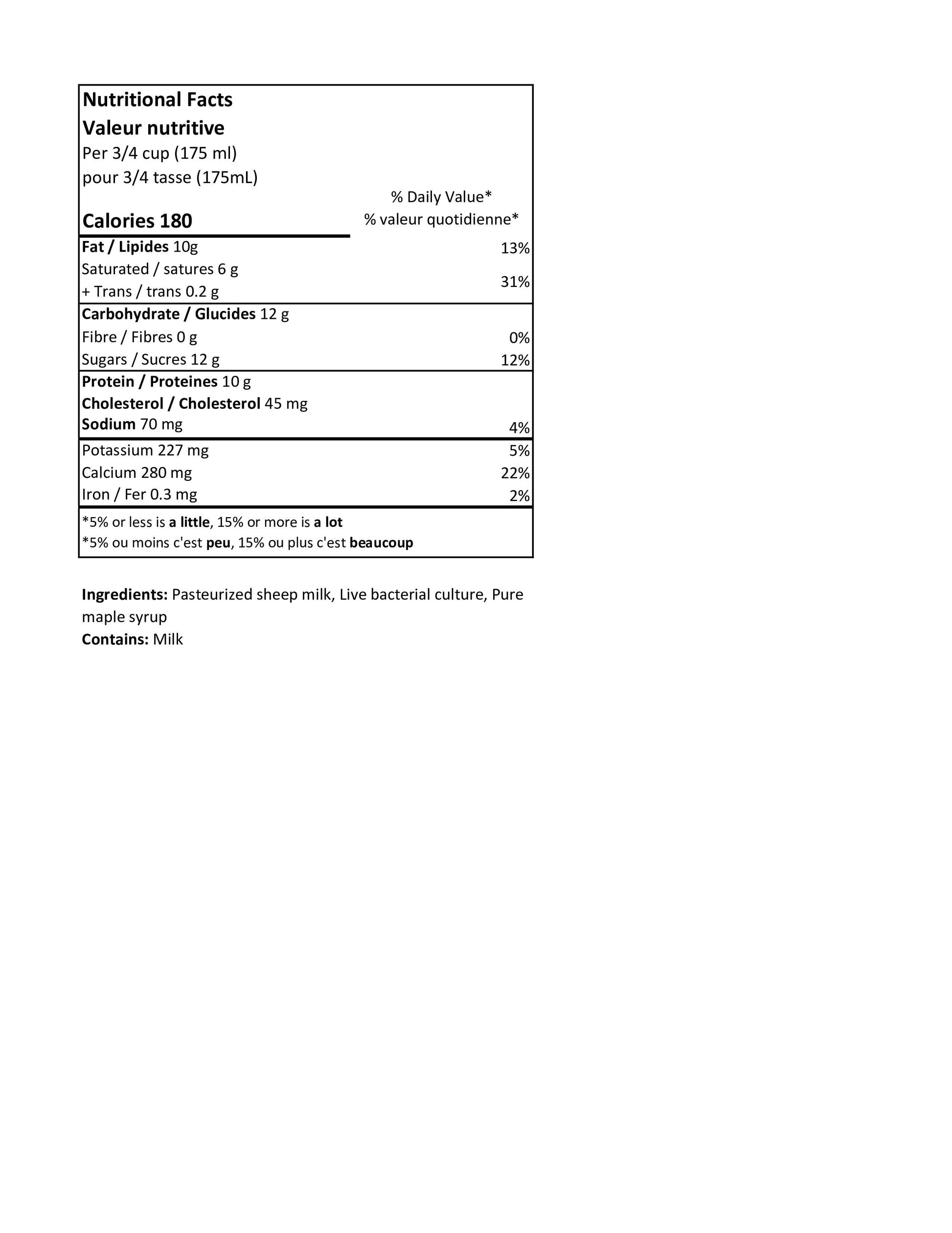 A rich creamy sheep yogurt that tastes like maple syrup. Made with sheep’s milk and bacterial culture, our Maple Yogurt has one additional ingredient: Pure Ontario Maple Syrup! Check out the only probiotic sheep milk on the market!