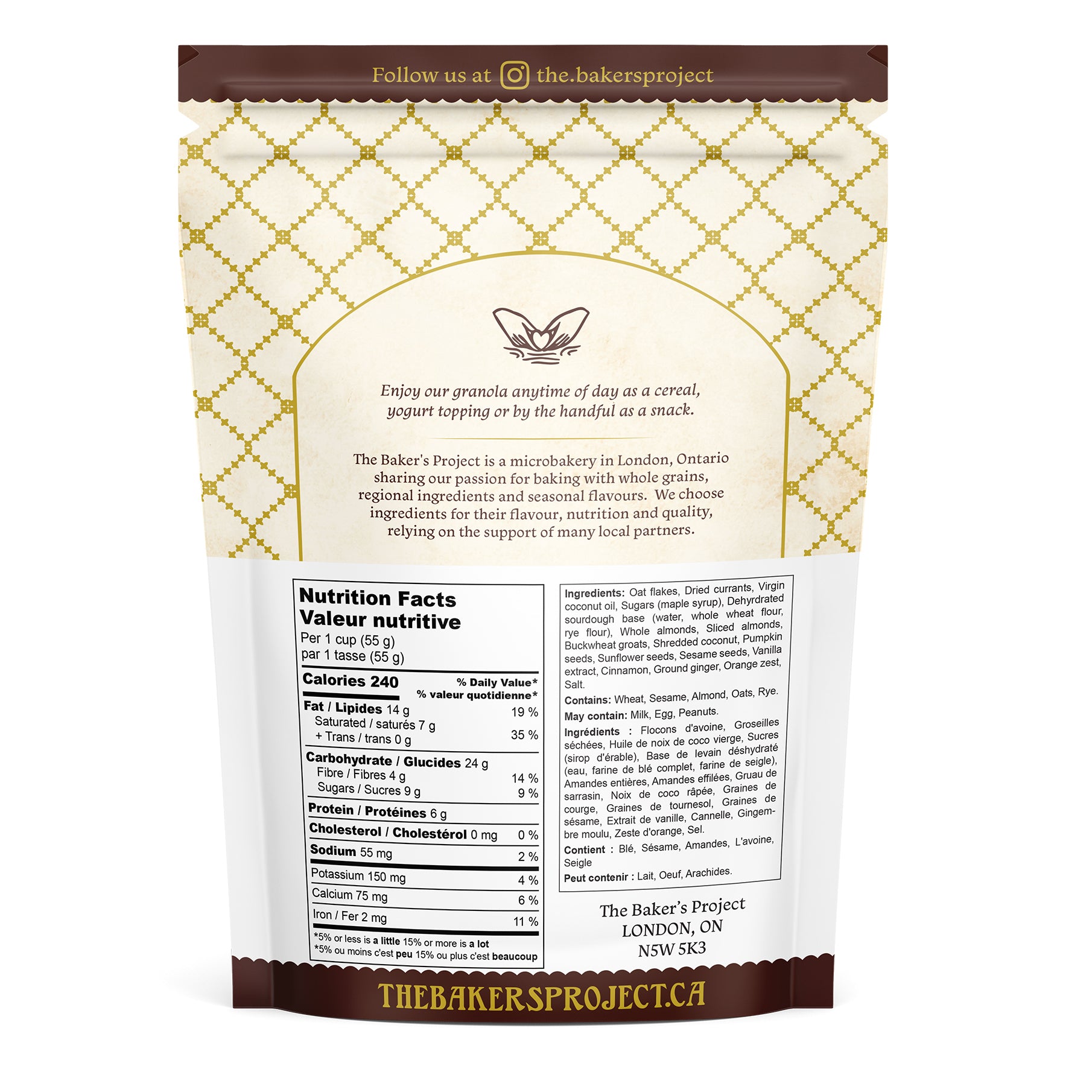 Our Almond Maple Granola is a rustic, slow roasted blend of seeds, almonds, coconut and sourdough starter, lightly sweetened with local dark maple syrup. Enjoy anytime of day with your favourite yogurt, fresh fruit or by the handful as a snack.