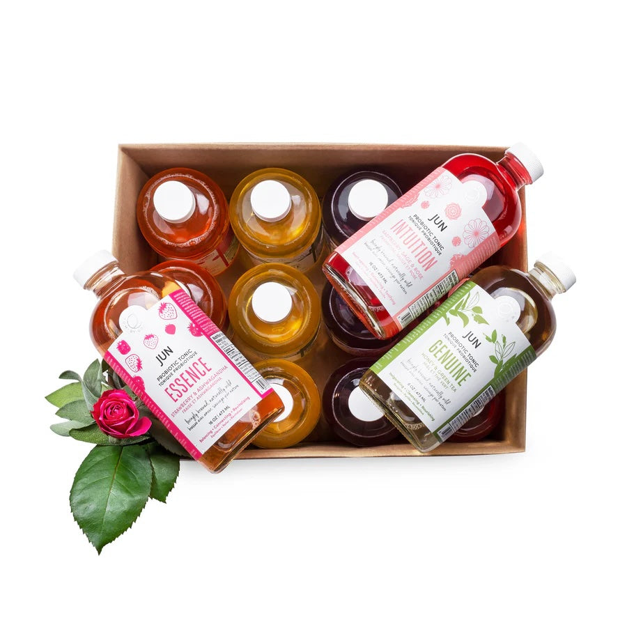Each and every brew is crafted using the same four ingredients of raw jun culture, organic honey, filtered water and organic Sencha tea. To ensure bioavailability of the bacteria, we do not pasteurize or force-carbonate.
