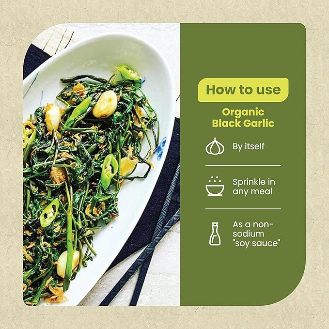 Not all black garlic is created the same. Ours are carefully aged over 30 to 40 days, to deliver a blend of umami-richness and complex sweetness, offering all the health benefits of garlic without the traditional garlicky taste, garlic breath, or sharp bite.