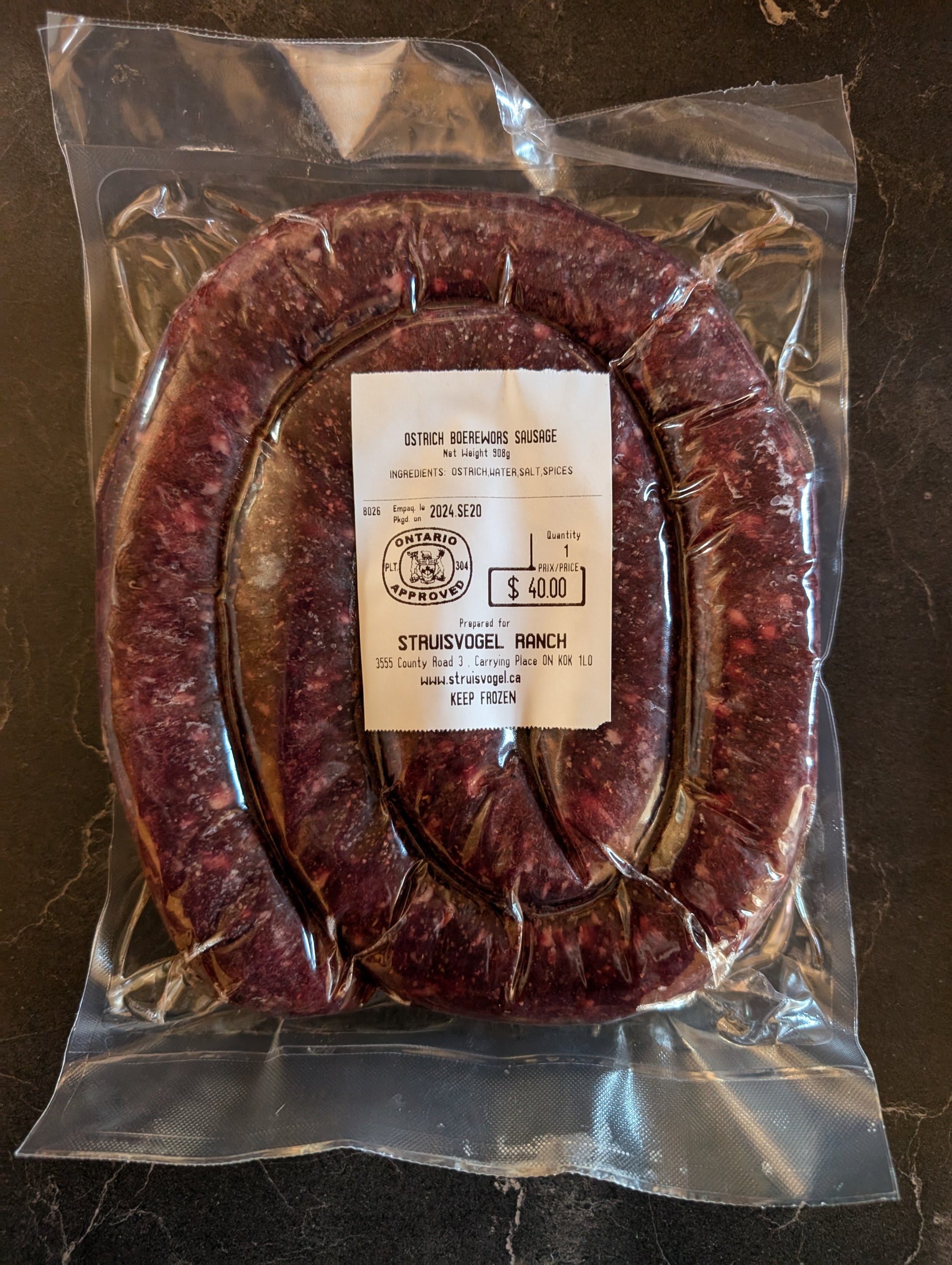 1.5lb 100% ostrich boerewors coil. Traditional South African seasoning. Perfect for the BBQ and for the whole group to share!