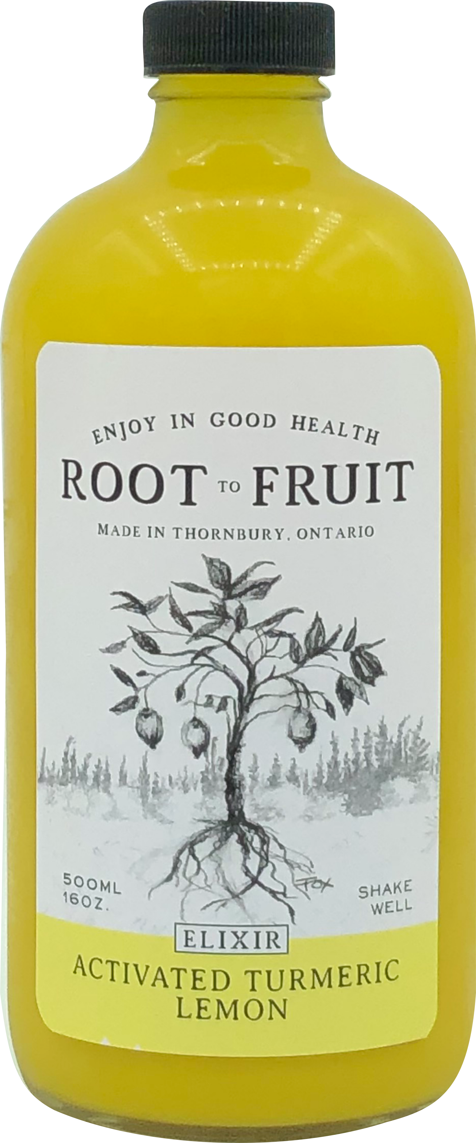 Root to Fruit Activated Turmeric Ginger LemonRoot to Fruit is handmade with love using organic and local ingredients on the shores of Georgian Bay. We activate our turmeric and make our elixirs bioavailable with a refrigerated shelf life of 10 weeks. SIP ON ITS OWN, WARM, COLD, OR GET CREATIVE AND KICK UP YOUR FAVOURITE BEVERAGE. 1oz.per Serving for 16 Servings per Bottle