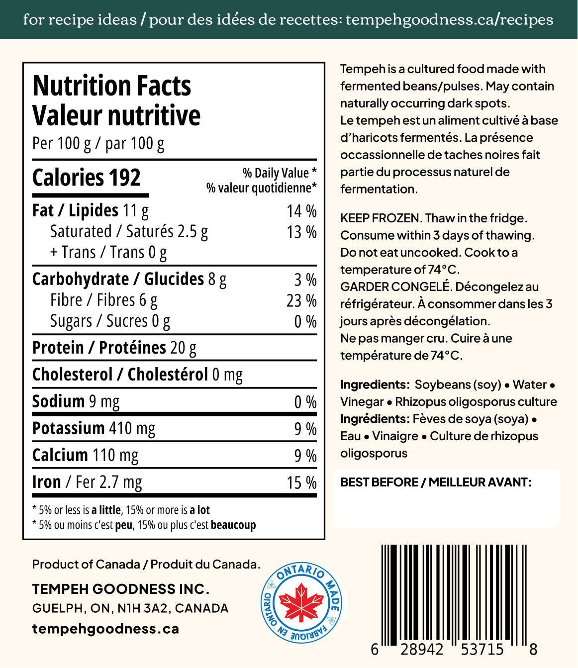 Discover the goodness of our fresh frozen tempeh, crafted with care in the heart of Guelph, ON. This unpasteurized, gluten-free fermented soy product is a powerhouse of nutrition, offering an excellent source of plant-based protein. Perfect for those seeking gut-loving, low-sodium, wholesome food options, our tempeh is fresh-frozen to preserve its natural, living culture and ensure optimal flavour, texture, and an unparalleled ability to absorb seasonings and marinades. Add this versatile ingredient to your favourite recipes for a healthy, satisfying meal. Whether you’re vegan, vegetarian, or simply looking to incorporate more plant-based proteins into your diet, our Canadian-made tempeh is the ideal choice.